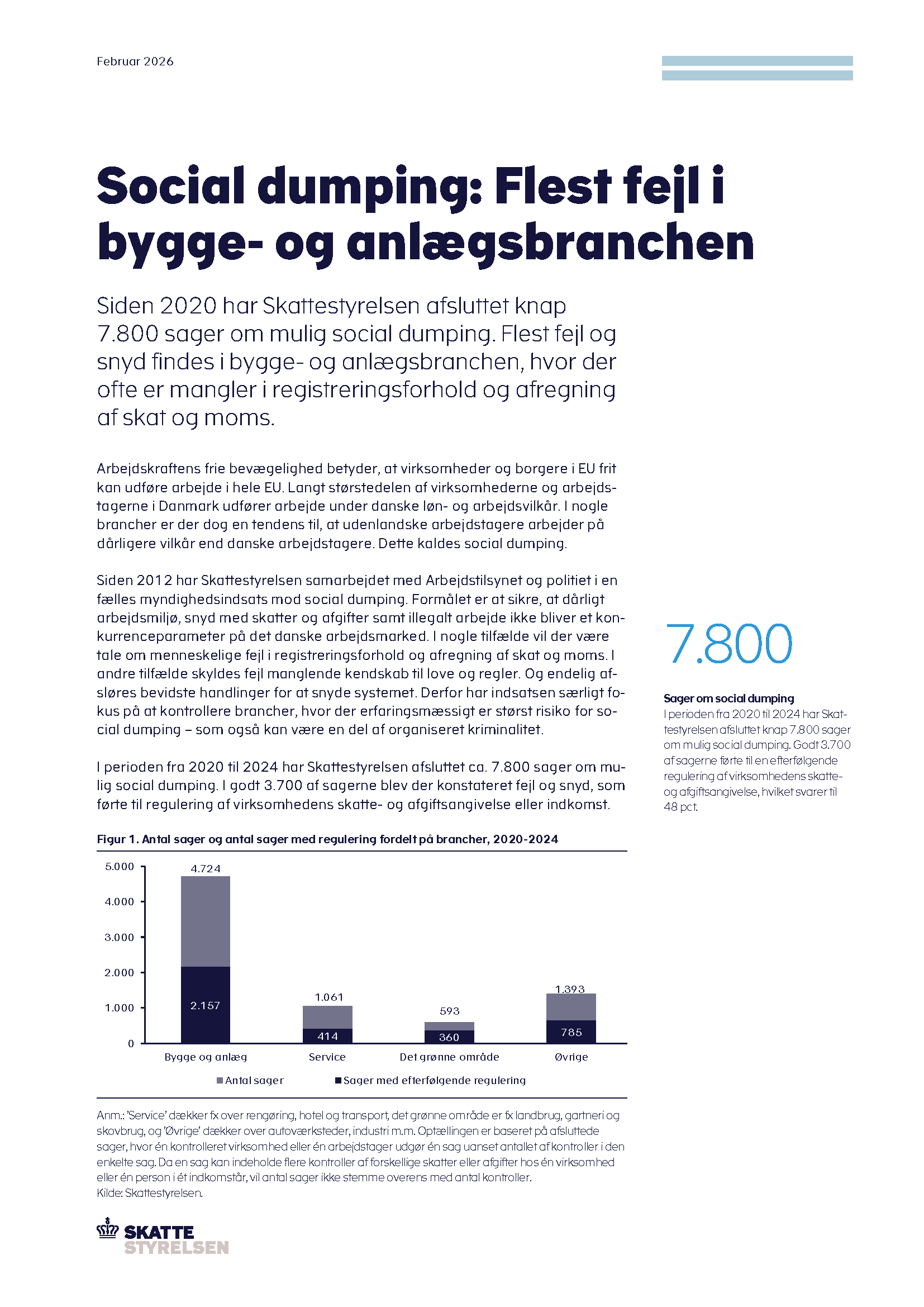 I perioden fra 2020 til 2024 har Skattestyrelsen afsluttet ca. 7.800 sager om mulig social dumping. I godt 3.700 af sagerne blev der konstateret fejl og snyd, som førte til regulering af virksomhedens skatte- og afgiftsangivelse eller indkomst.