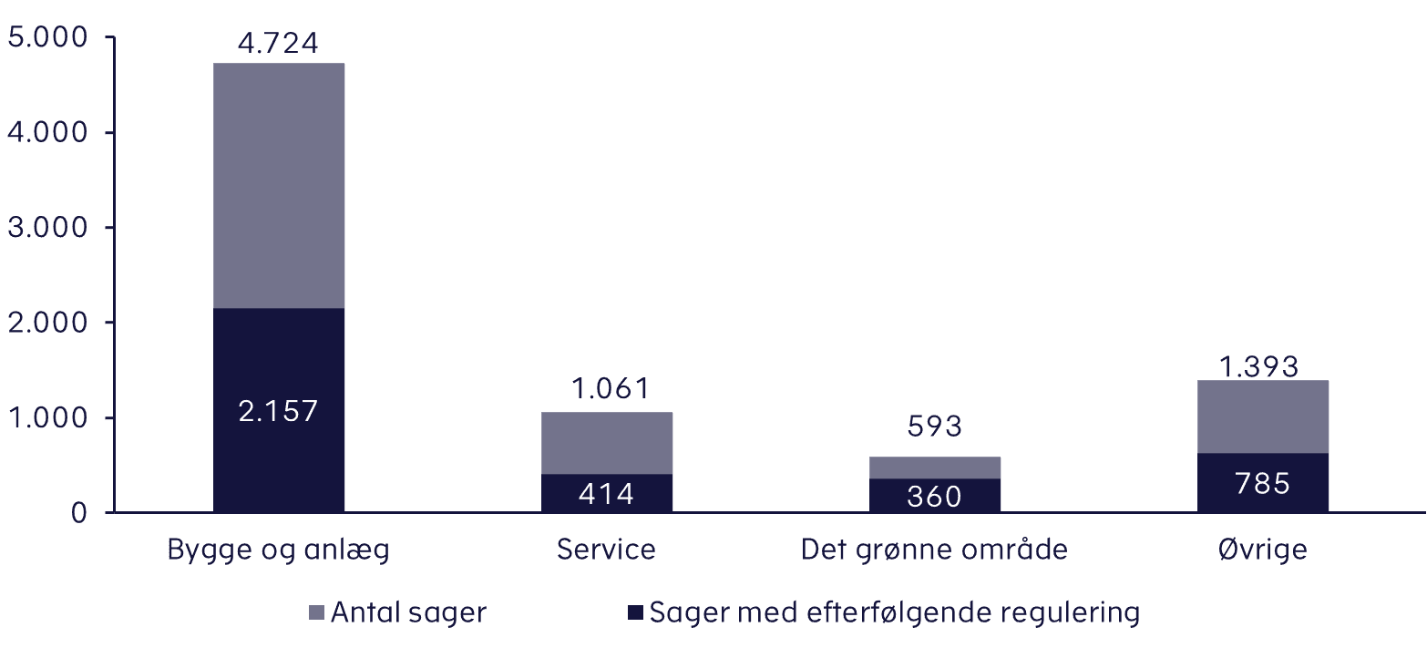 Ud af de 7.800 sager afsluttede Skattestyrelsen knap 5.000 sager i bygge- og anlægsbranchen. Det er dermed den branche, hvor der er gennemført flest sager i perioden. Samtidig er der fundet højest træf blandt virksomheder fra det grønne område. Her førte godt 350 ud af de 600 gennemførte sager på området til en efterfølgende regulering. Det svarer til 60 pct. af sagerne i branchen.