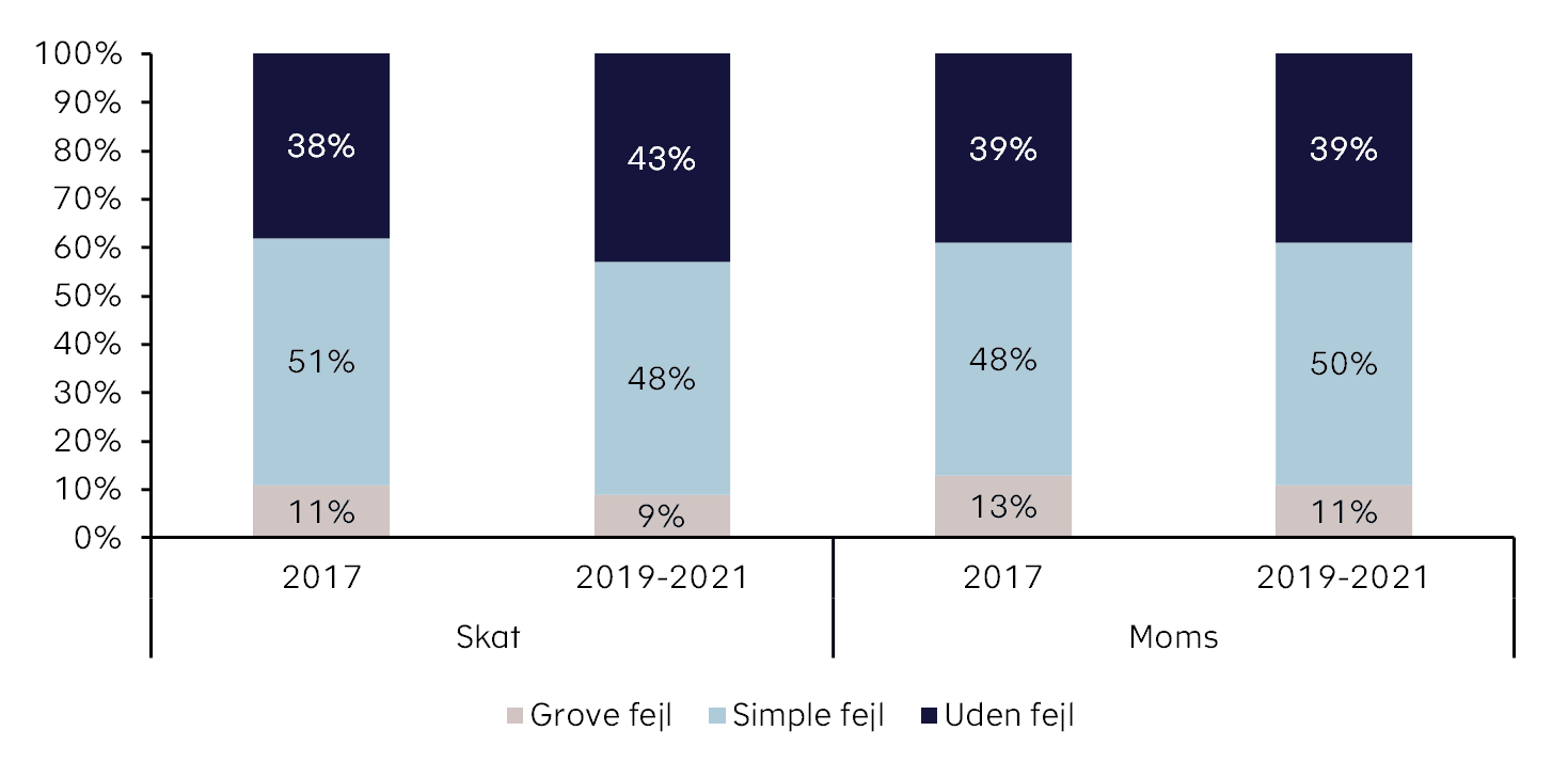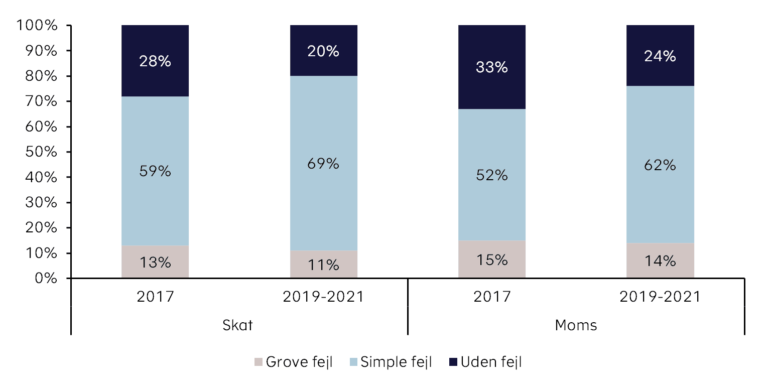 Til sammenligning er der for de selvstændigt erhvervsdrivende sket en stigning fra 2017, som primært kan tilskrives en stigning i simple fejl, jf. figur 2. Det er tilmed kun hver femte af de selvstændigt erhvervsdrivende, som indberetter et oplysningsskema helt uden fejl. I perioden fra 2019 til 2021 begik fire ud af fem selvstændigt erhvervsdrivende fejl i skatteangivelsen, mens tre ud af fire begik fejl i momsangivelsen.