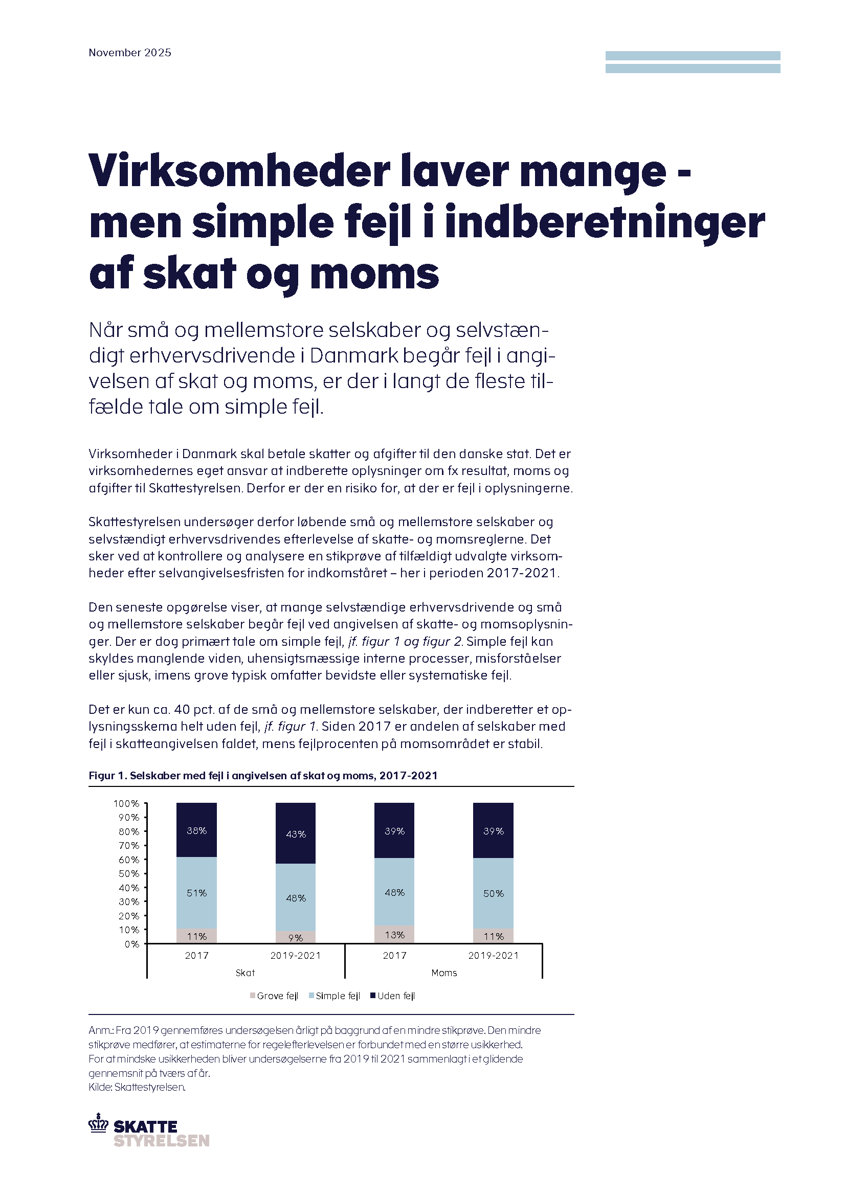 Den seneste opgørelse viser, at mange selvstændige erhvervsdrivende og små og mellemstore selskaber begår fejl ved angivelsen af skatte- og momsoplysninger. Der er dog primært tale om simple fejl, jf. figur 1 og figur 2. Simple fejl kan skyldes manglende viden, uhensigtsmæssige interne processer, misforståelser eller sjusk, imens grove fejl typisk omfatter bevidste eller systematiske fejl.